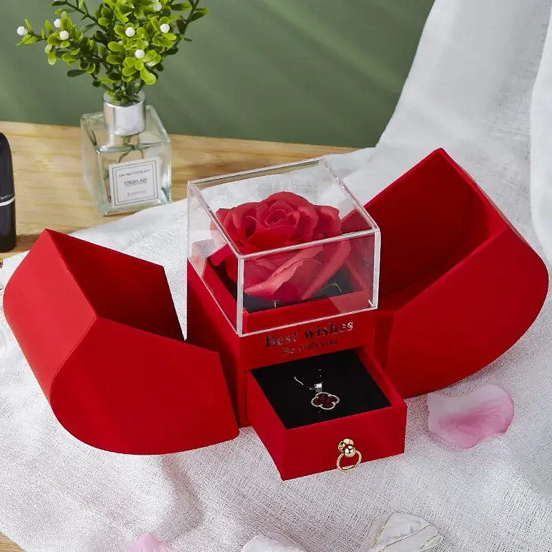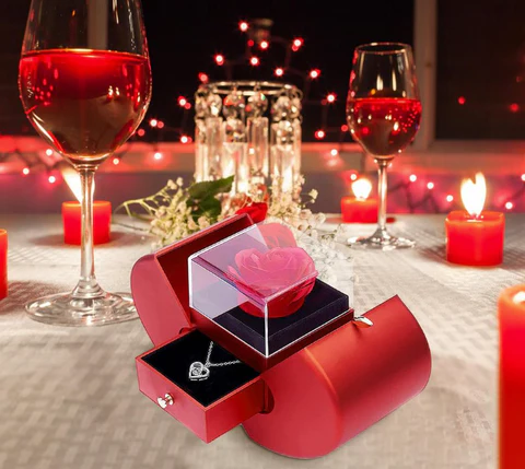 Sua embalagem, além de linda, quando se abre revela uma belíssima rosa perfumada com proteção em acrílico, um colar e uma carta especialmente para seu amor